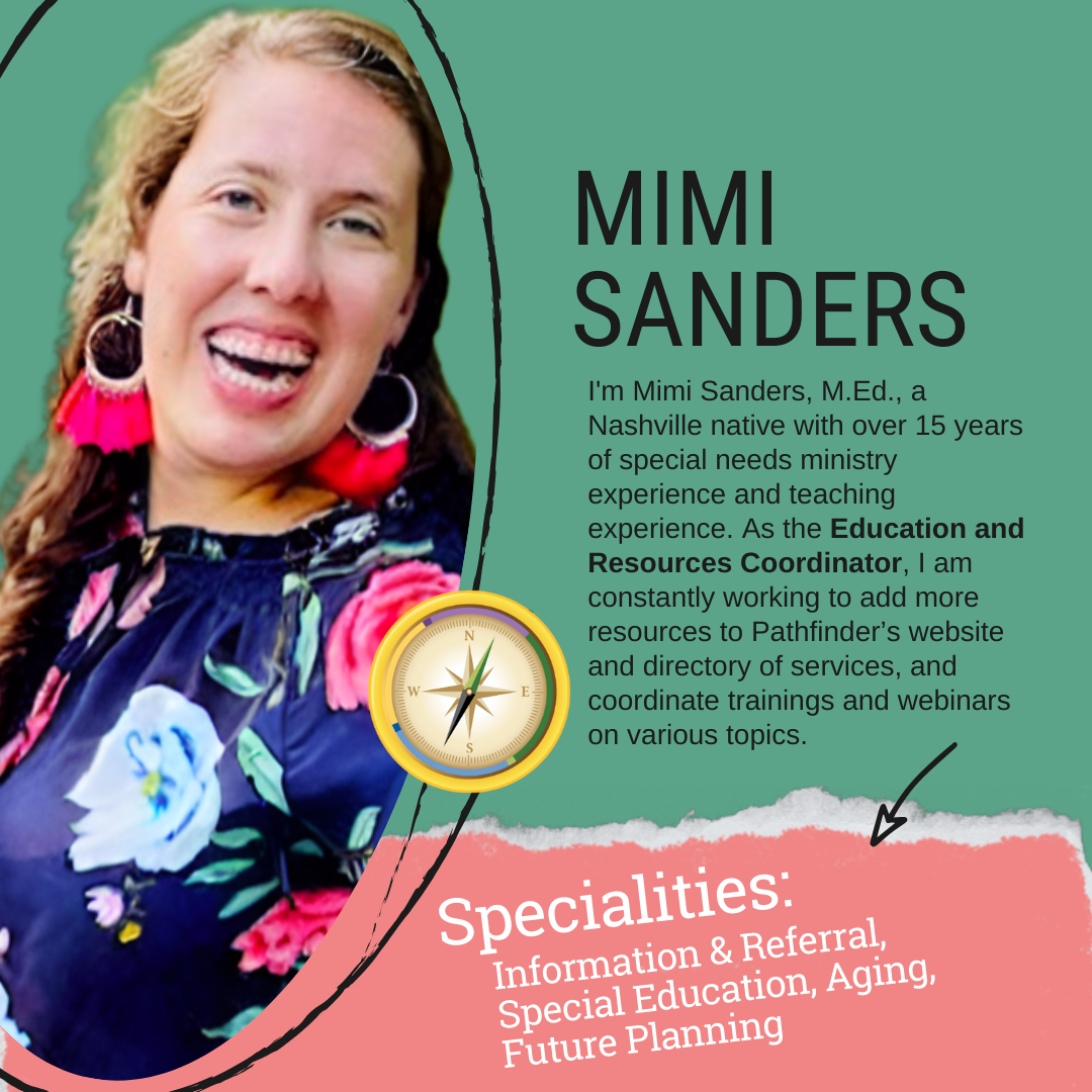 Margaret “Mimi” Sanders, M.Ed., is a Nashville native,  studied Elementary Education at Lipscomb University and graduated from Vanderbilt University with a Masters in Special Education, which gives her a great foundation to work on the Pathfinder team. As an Education and Resources Coordinator, Mimi is constantly working to add more resources to Pathfinder’s website and database. She also helps coordinate trainings and webinars on various topics. Mimi has over 15 years of special needs ministry experience, as well as teaching experience.